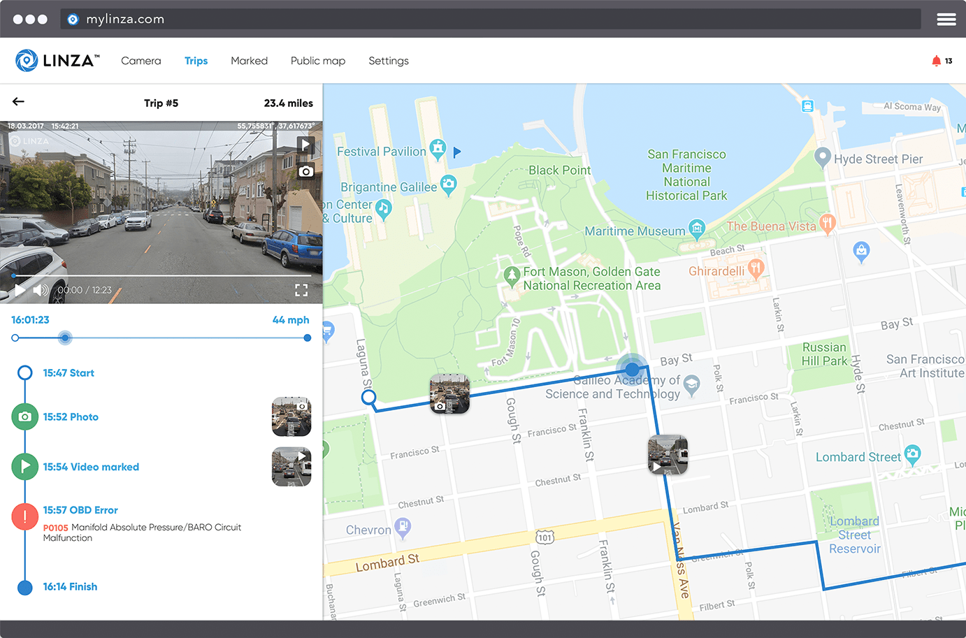 With a built-in GPS sensor, Linza constantly logs your road trip parameters and displays all your routes on a map in your smartphone application or on the web.